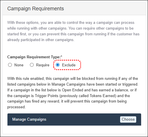 - Excluded: When this rule is activated, the current campaign will be prevented from running if any of the campaigns listed under Manage Campaigns have been initiated or triggered. Specifically, if a campaign listed below is Open Ended and has accrued any balance, this will block the current campaign from being processed. If a campaign listed below is a Trigger Points campaign (previously referred to as "Tokens Earned") and it has issued any rewards, this will also prevent the current campaign from running.