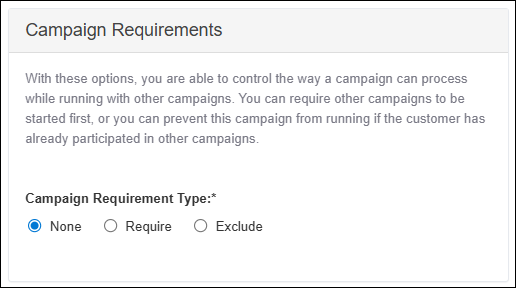 - None: This setting indicates that the campaign has no specific prerequisites or conditions for a customer to participate. Any customer can join and benefit from the campaign regardless of their engagement or status with other campaigns. This is the most straightforward type of campaign with no dependencies or restrictions.