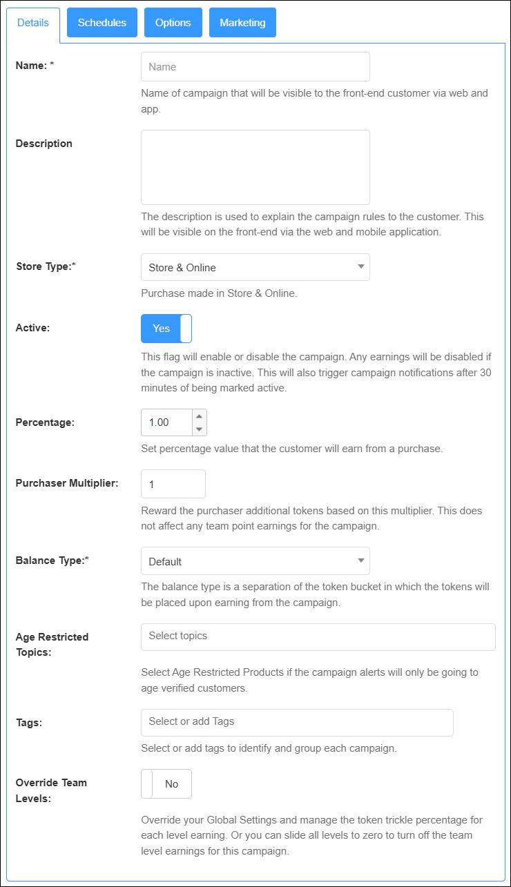 Note: When this setting is set to “Yes,” an additional field will appear that allows you to select Team Breakdowns by levels. The slider can be used to override the levels.- Tags: You can add or select tags from the drop-down list to identify and group each campaign.