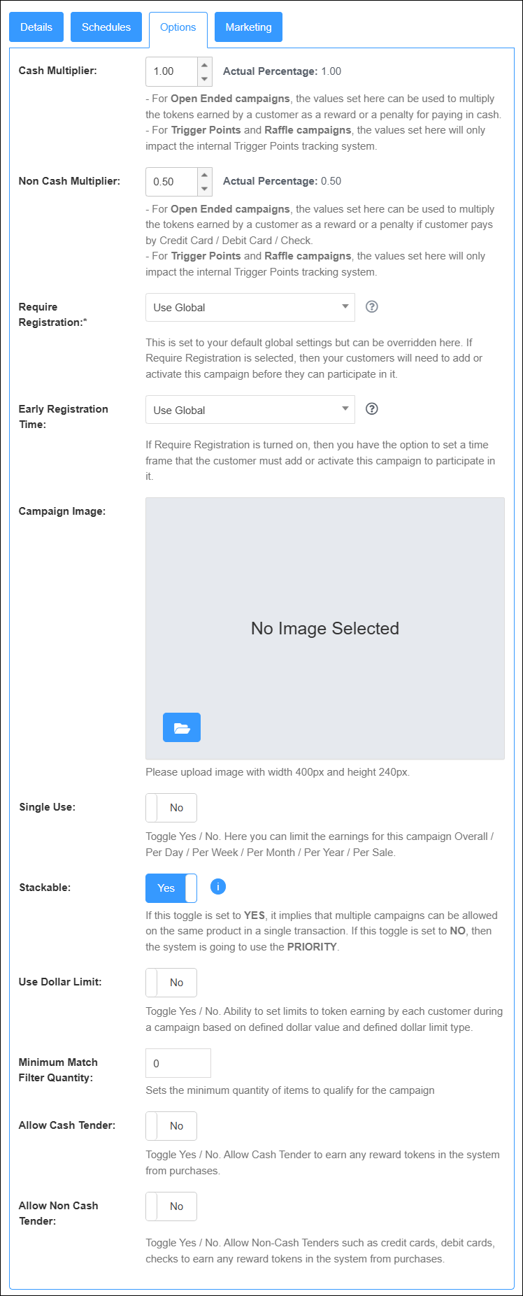 Note: If this value is not set at the Campaign level, customers will not earn tokens for the given campaign.- Non Cash Multiplier: The Non Cash Multiplier is a factor used to adjust the number of tokens a customer earns when making payments with non-cash methods, such as credit cards, debit cards, or checks.