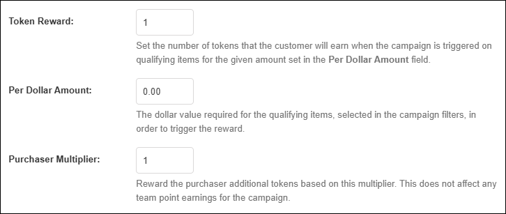 - Tokens Per Dollar Value in Tokens: This campaign sets up awards tokens based on the amount the customer spends, in increments of the specified dollar value. In this reward type, for every dollar a customer spends, they earn a certain number of tokens.