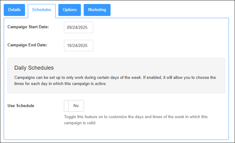 - Use Schedule: Toggle Yes/No. Use this option to run this campaign as planned. By toggling this option to "Yes," an additional field called Campaign Schedules appears as shown below: