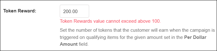 Note: Token Reward cannot exceed 100 tokens. If the retailer enters more than 100 tokens, then a validation message will be displayed as shown below: