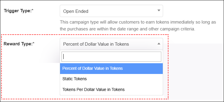 If the Reward Type is set to Percent of Dollar Value in Tokens, then the following fields are required to be filled out: