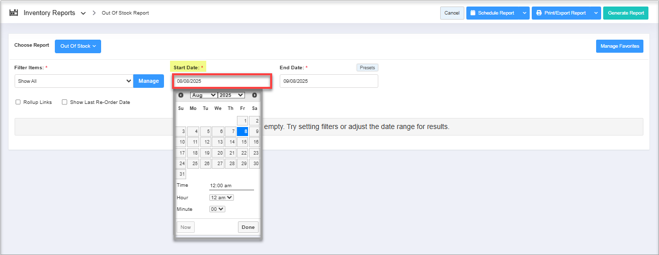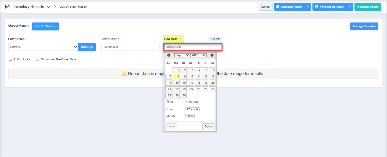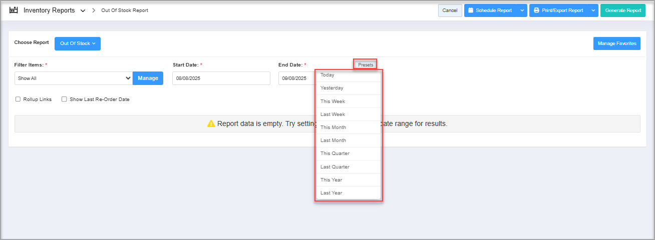 - Presets: The presets label is provided to select the specific duration/interval to generate the Out Of Stock Item Report according to the specified time period.