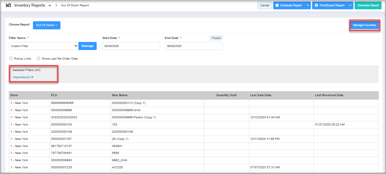 You can generate the Out Of Stock Report for all store locations with the "Show All" option or a customized report with "Custom Filter."