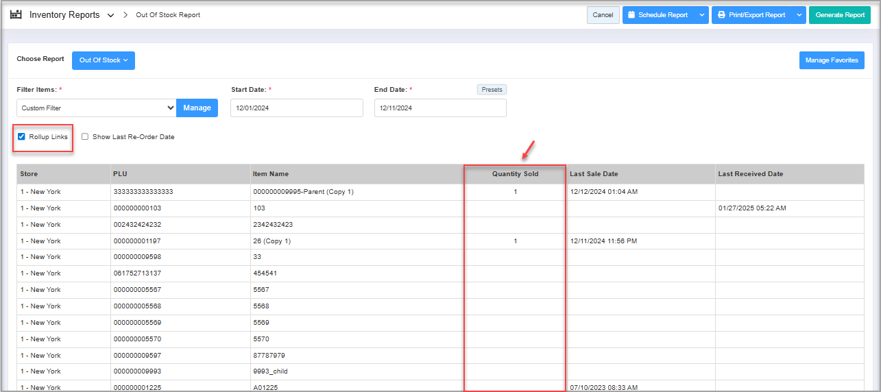- Allow Rollups: Check this filter to display the out-of-stock parent and child items' sold quantity value in decimal number format. Figure 4.2