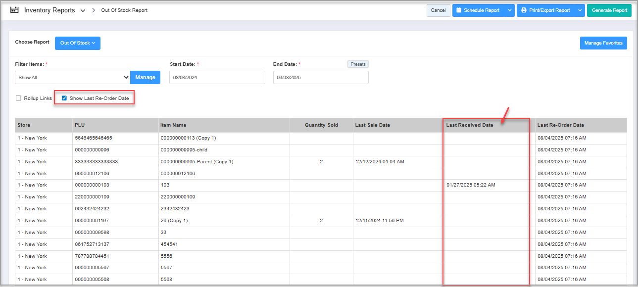 - Show Last Reorder Date: Check this filter to display the last reorder date column for the item that is out of stock in the resultant report.