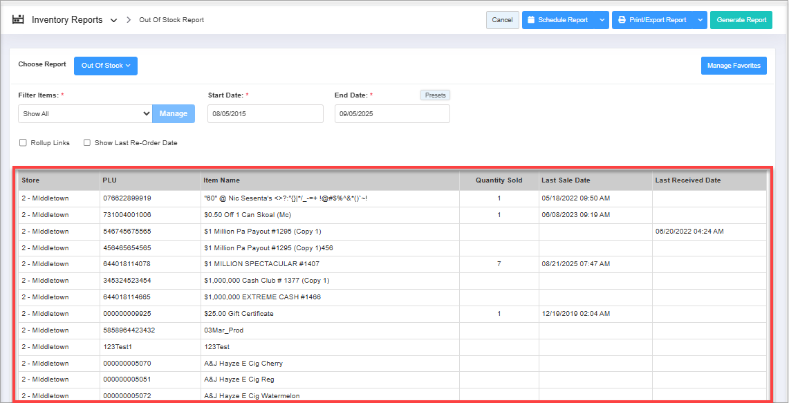 The system will also display the PLU (Price Look-Up Unit), the product name, the store name, the total quantity sold to date, and the last date of sale. This article focuses on how to generate a report of items that are out of stock as per various filters.