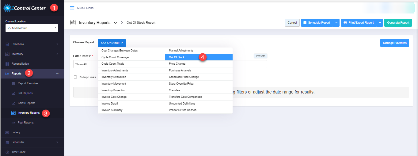 To generate the "Out Of Stock Report," follow the steps below. (See Figure 2.1 above).
