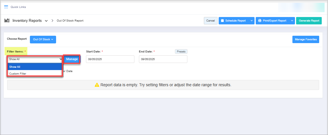 - Custom Filter: To customize the items for the report, you need to select the "Custom Filter" option. Once you select it, the "Manage" button will be enabled to set up the filters.