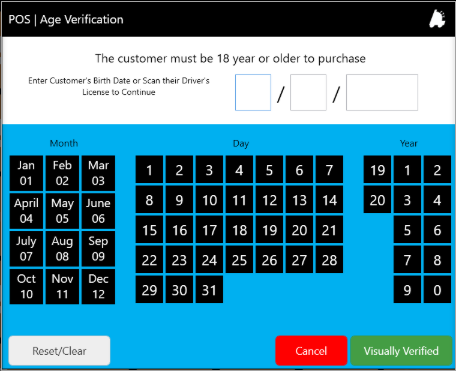 - When the manager logs in, the POS | Age Verification screen will look like the one shown in Figure 1.1.5.4. The manager can manually enter the date or click the "Visually Verified" button to complete the age verification process. Figure 1.1.5.4