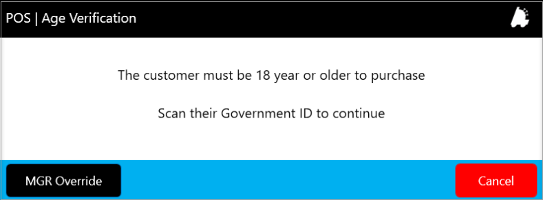 If the corporate employee is required to scan their driver's license or government ID, the system will display the POS | Age Verification screen, as shown in Figure 1.1.5.1. The cashier must scan the customer's driver's license or government-issued ID to sell the product.