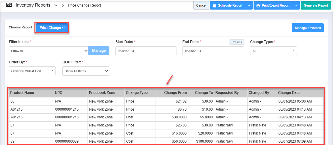 When you click on "Price Change," the Price Change Report screen will open with relevant filtering and sorting options.
