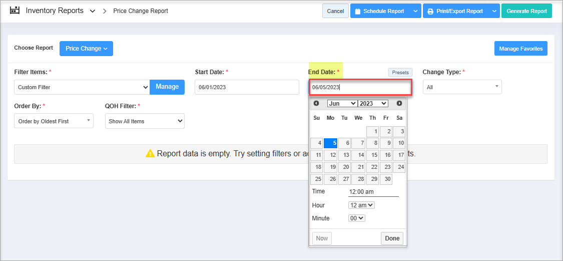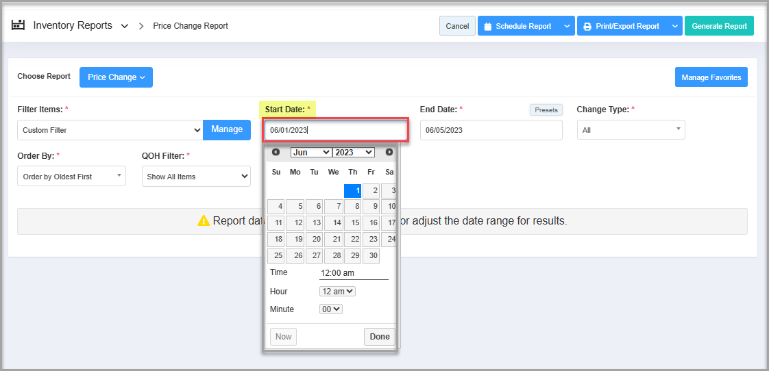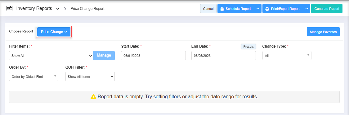 - Navigate to the Price Change Report screen.