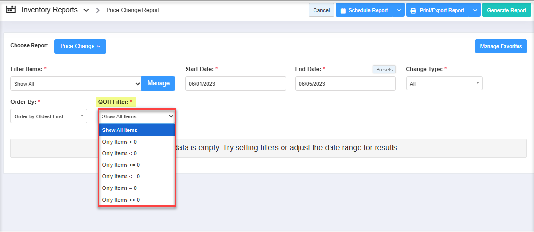 By default, the system will select "Show All Items." Click the QOH Filter drop-down highlighted in Figure 4.6.1 to change it.
