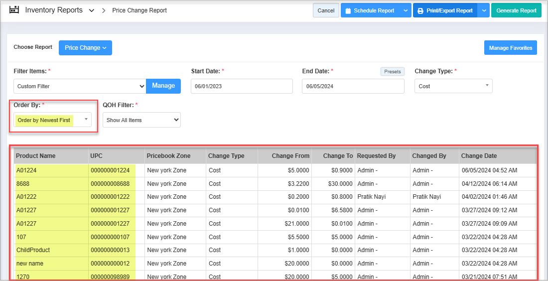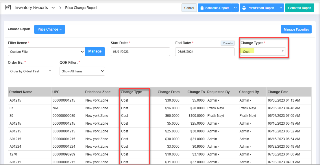 - Select "Cost" and click "Generate Report." The system will generate and show records with changes in product cost.