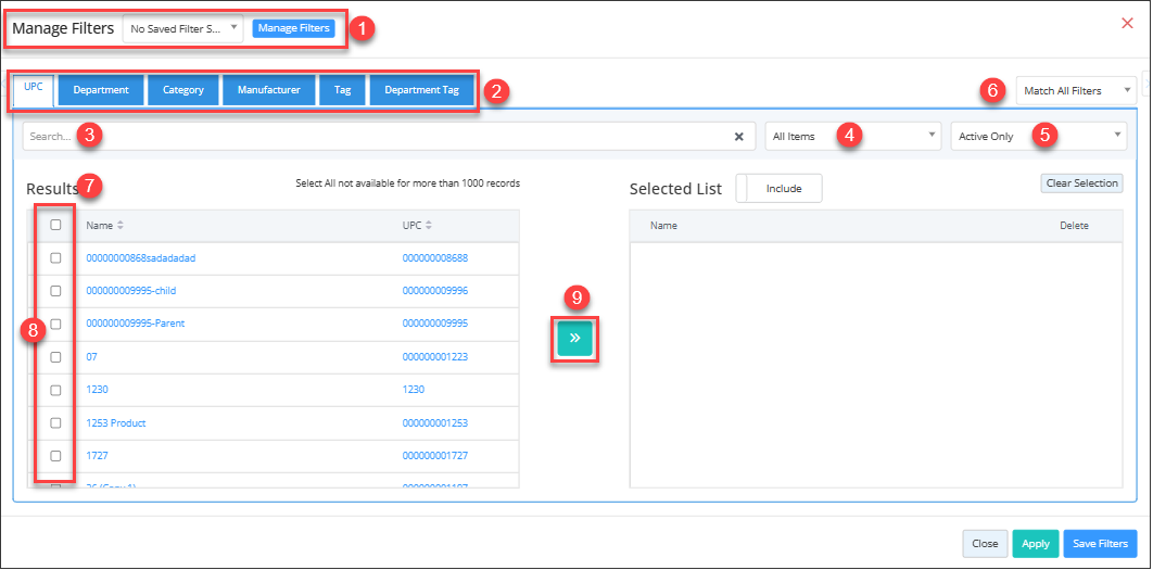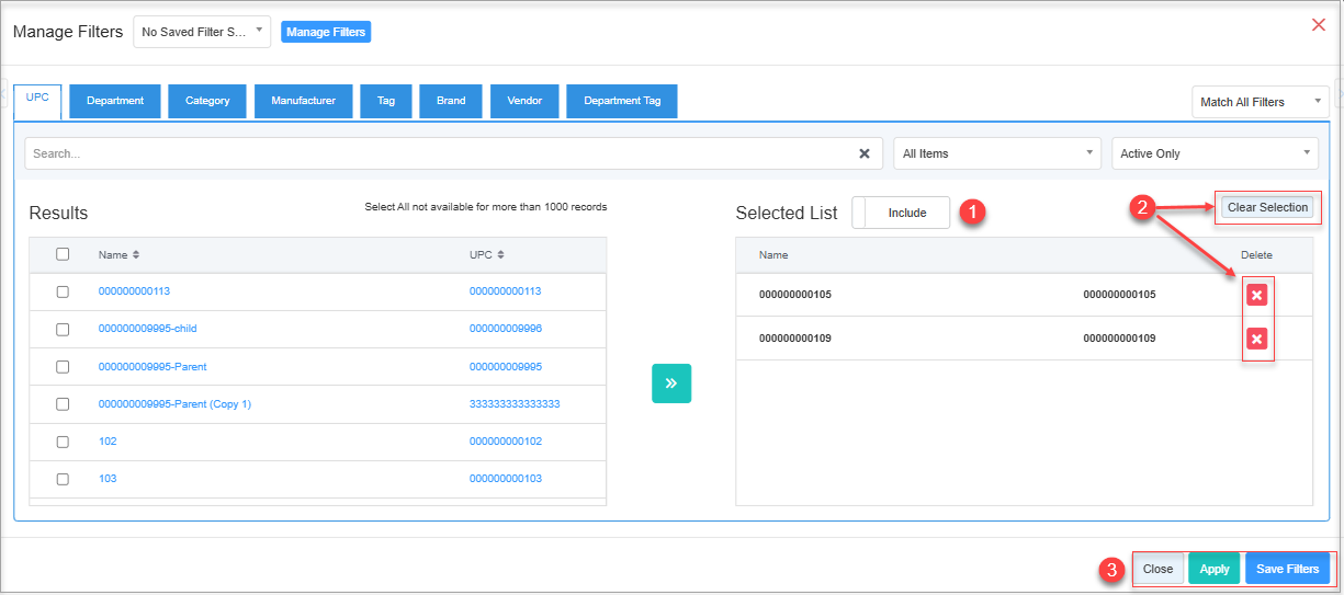 - Here you see the Manage Filters screen data relevant to the selected tab. For example, if you have selected the "UPC" tab, it will show the list of all UPCs.