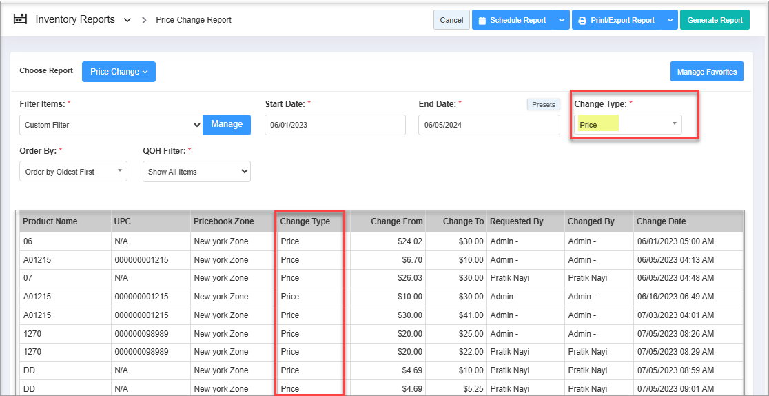 The Change Type filter shows if the record indicates a product price or cost change. By default, the system selects "All" (see Figure 3.1). Click the Change Type drop-down highlighted in Figure 4.4.1 to change it.