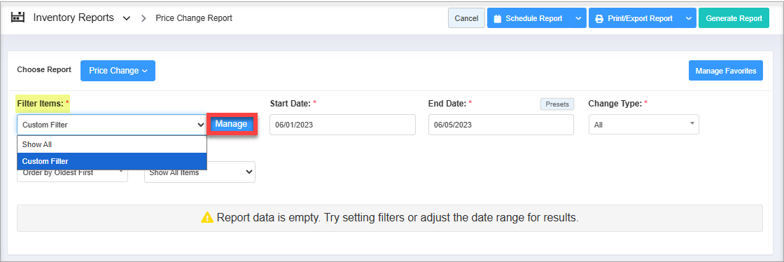 Figure 4.1.1- Select the saved custom filters from the Manage Filters drop-down (if any) and click "Apply" to apply the saved custom filter. The system will redirect you to the Price Change Report home screen. Click "Generate Report" to generate the report for the selected filter. Clicking the "Manage Filters" button will also open the list of saved custom filters.