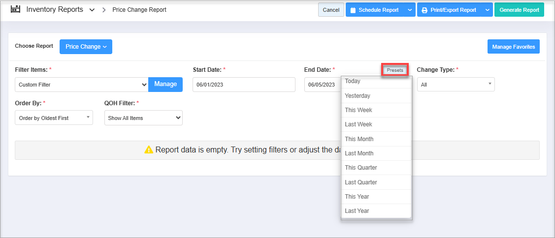 Figure 4.2.2- Presets: Use the Presets drop-down to select the specific duration/interval, i.e., Today, Yesterday, This Week, Last Week, etc., to generate the Price Change Report as shown in Figure 4.2.3.