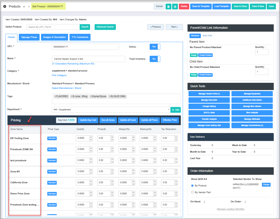The newly created Pricebook Zone appears on the Product Edit page, allowing the admin to set the product’s cost and price specific to that zone. Refer to Figure 2.1.1.1.