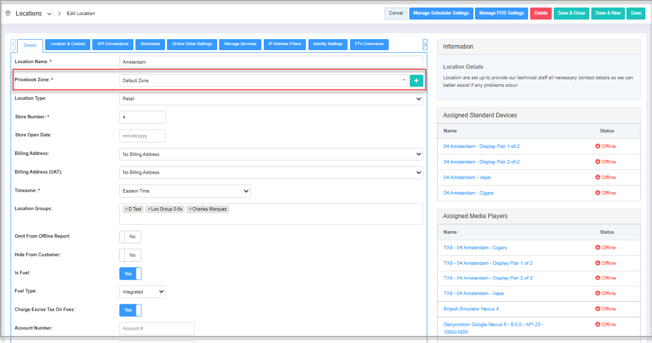 The admin user can select the Pricebook Zone when setting up a new or existing location.