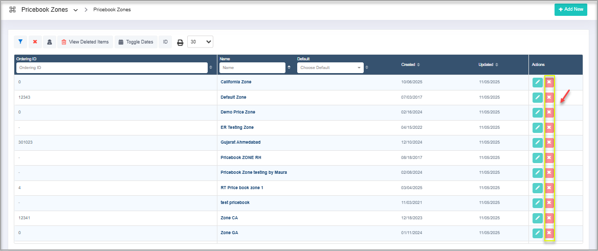 Click the Delete icon highlighted in Figure 2.1 to delete the Pricebook Zone.
