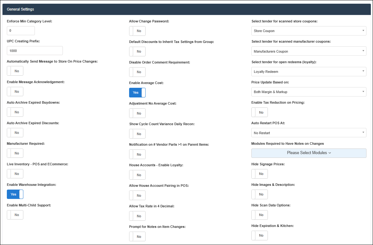 22. Live Inventory - POS and ECommerce: If this toggle is set to Yes, the system will sync the inventory changes from Control Center to POS and E-commerce. If set to No, the changes in the control center will not sync with POS and E-Commerce.