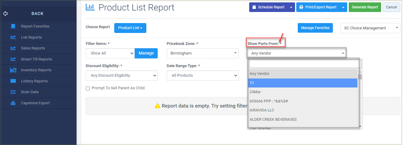 - Vendor: If you select "Vendor," you will get vendor-specific data for the group that is entered in the product details.
