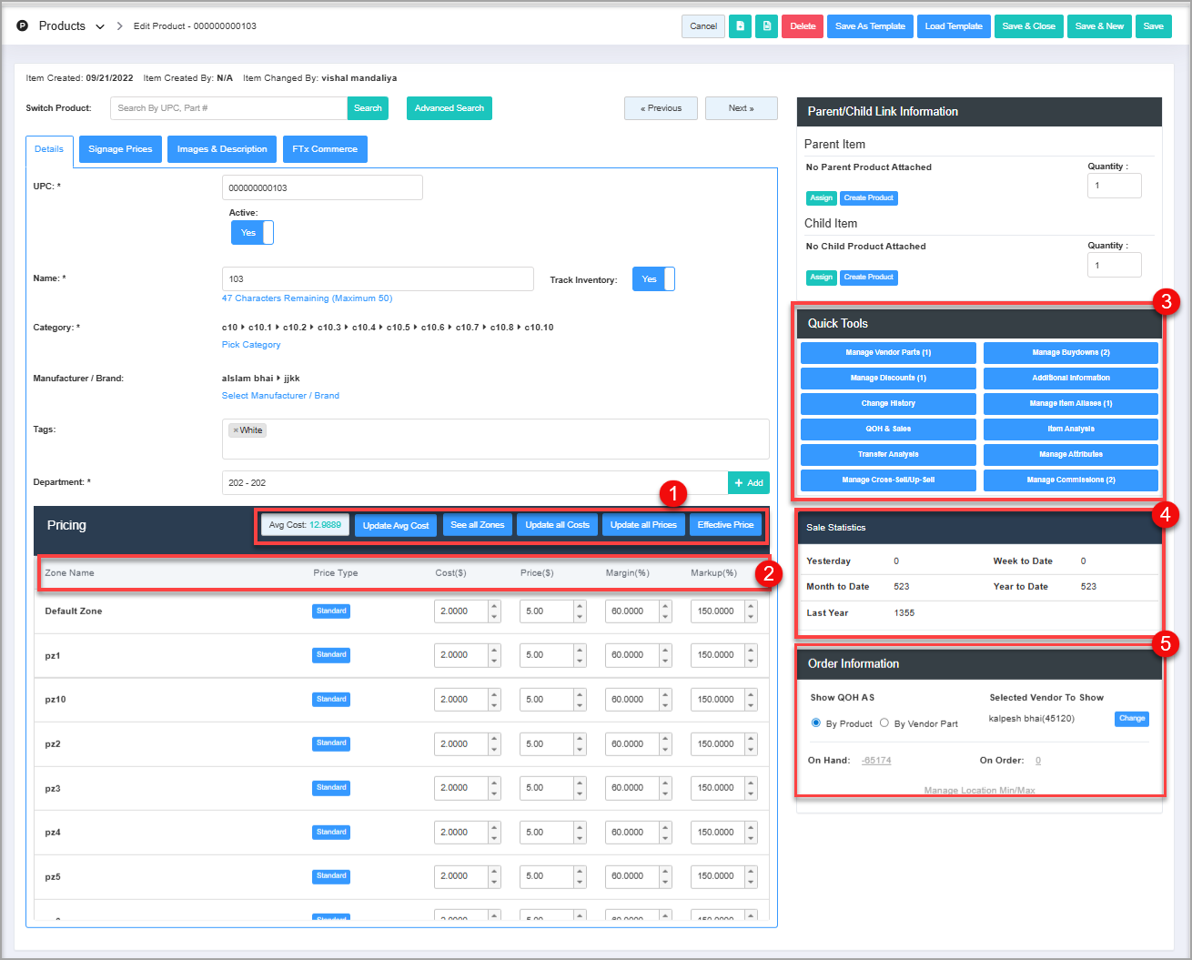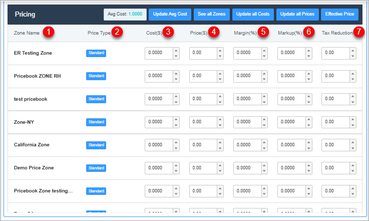 - Cost Per Zone: The Cost Per Zone section allows you to set the products' costs with respect to their respective pricebook zones. The Cost column allows you to add/edit the product's cost.