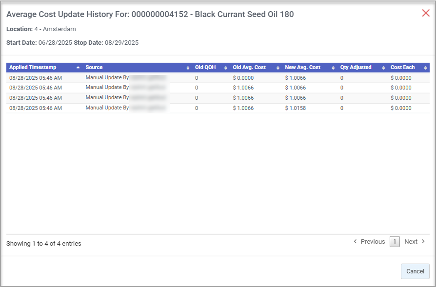 - The "Old Avg. Cost" and "New Avg. Cost" columns show the average cost values before and after the manual update.
