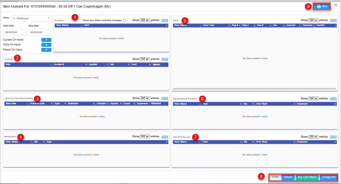 - Cycle Count & Spot Checks: This part of the Item Analysis defines the inventory counting details of the selected store and the selected date range.