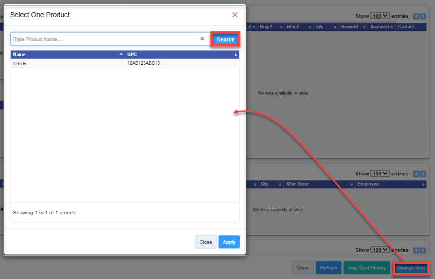 - Adjustment & Transfers: This part displays all the adjustment and transfer data for a particular item, such as Time Stamp, Type, Quantity, XFer (Transfer) Store, and Employee for the selected store and selected date range.