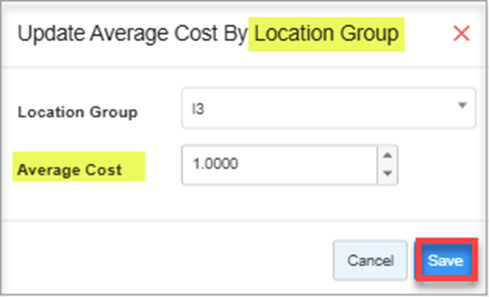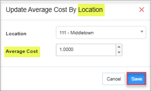2. Update by Location – This button allows you to update the average cost for a specific location. Select a location from the drop-down menu, adjust the Average Cost as needed, and click "Save."