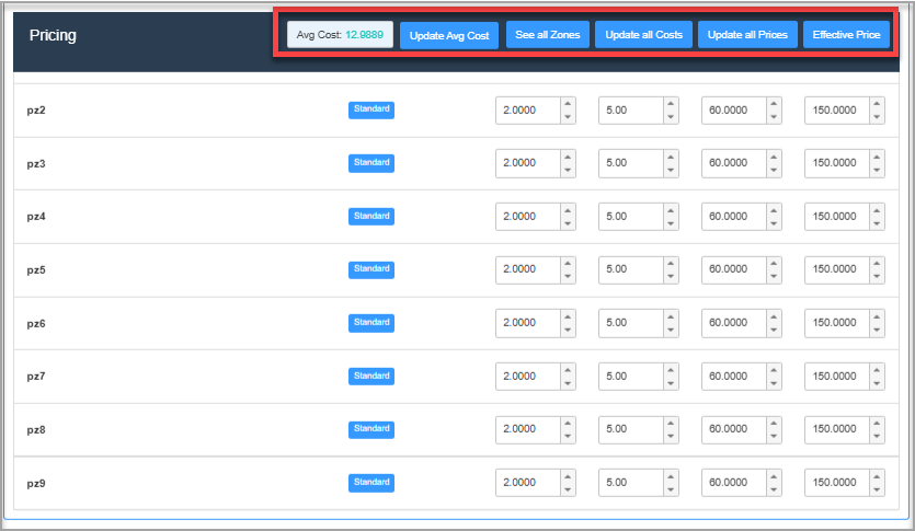 - See All Zones: This field is just for your information. The system automatically generates a list of all pricebook zones in a single pop-up window. It will display the purchase costs, selling prices, and profit margins applicable to each pricebook zone.