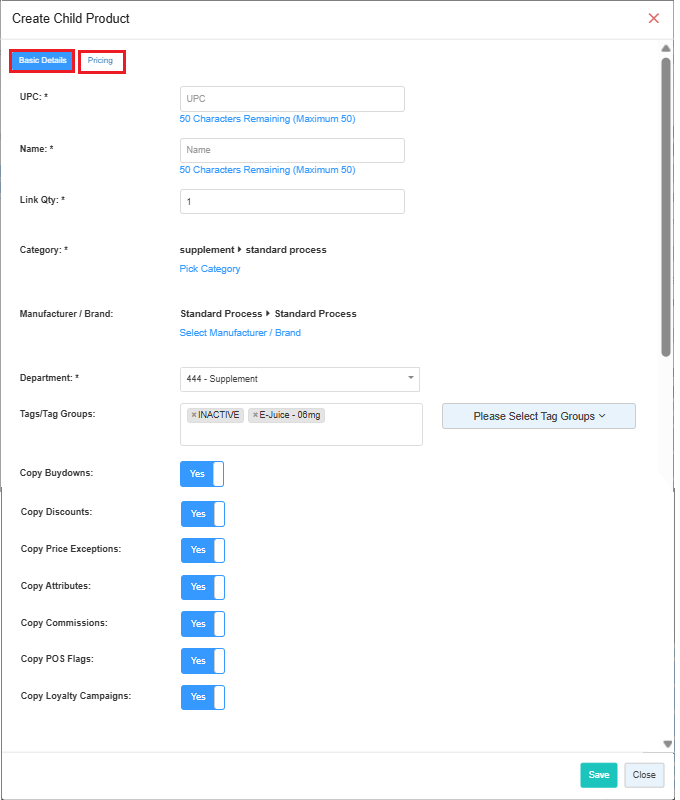 8. Copy Attributes: When enabled, the system will automatically copy all attributes linked to the product being loaded to the new product record. If disabled, the system will disregard the attributes but will transfer all other relevant details to the new product record.9. Copy Commissions: When enabled, the system will automatically copy all commissions linked to the product being loaded to the new product record. If disabled, the system will disregard the commissions but will transfer all other relevant details to the new product record.10. Copy POS Flags: When enabled, the system will copy all POS flags linked to the product being loaded automatically to the new product record. If disabled, the system will ignore the POS flags but will copy all other relevant details to the new product record.11. Copy Loyalty Campaigns: When enabled, all campaigns linked to the product being loaded will be copied automatically to the new product record. If disabled, the system will disregard the campaigns but will transfer all other relevant details to the new product record.12. Copy Cost: When enabled, the system will automatically copy the product's cost information to the new product record. If disabled, the cost details will not be copied, but all other relevant details will be transferred to the new product record.13. Copy Price: When enabled, the system will automatically copy the product's pricing information to the new product record. If disabled, the pricing details will not be copied, but all other relevant details will be transferred to the new product record.14. Copy Additional Information: When enabled, all additional information linked to the product being loaded will be automatically copied to the new product record. If disabled, this information will not be copied, but all other relevant details will be transferred to the new product record.Click on the