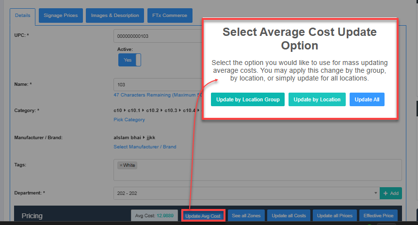 - Click the “Update All Costs” button provided in the Pricing section. A confirmation dialog box labeled Select Cost Update Option will appear on your screen.