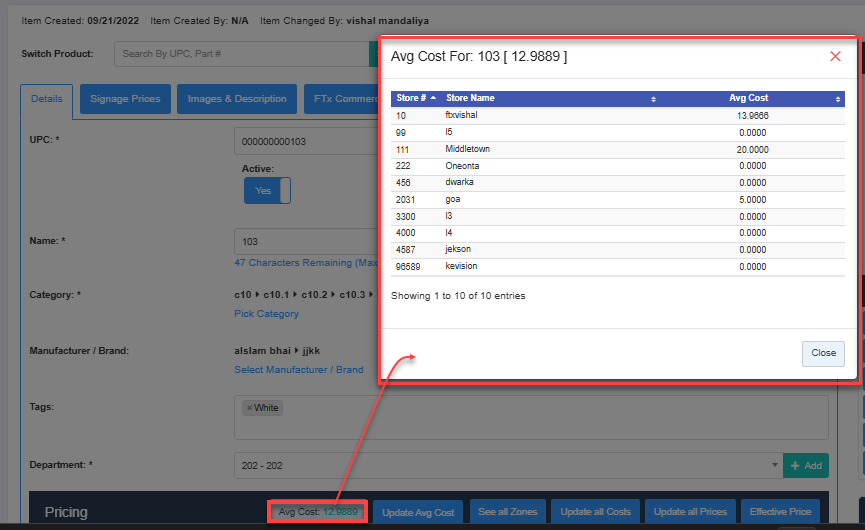 Clicking this button displays the store-wise average cost of an item along with its overall average cost across all store locations.