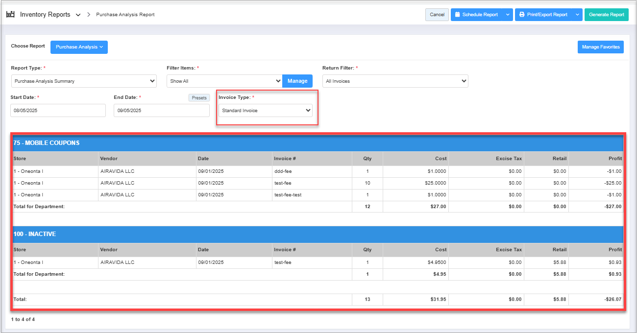 All: This option is selected by default, which means that when you generate the report, the purchased data will be included for both invoice types.