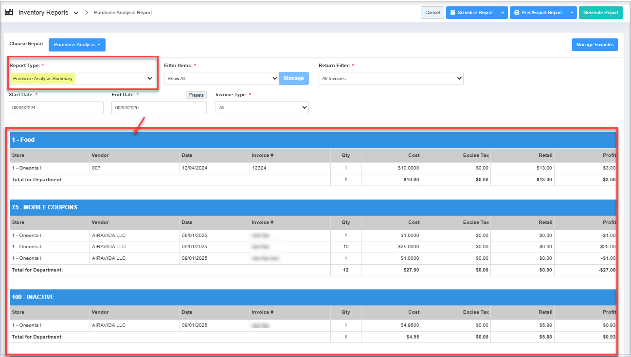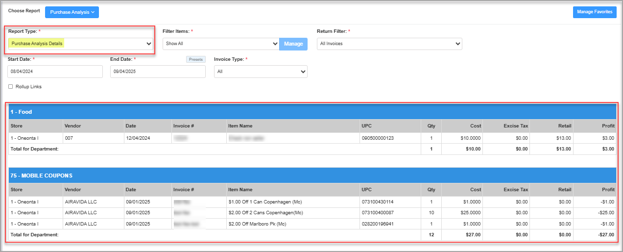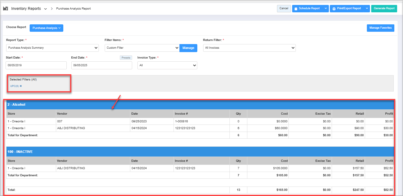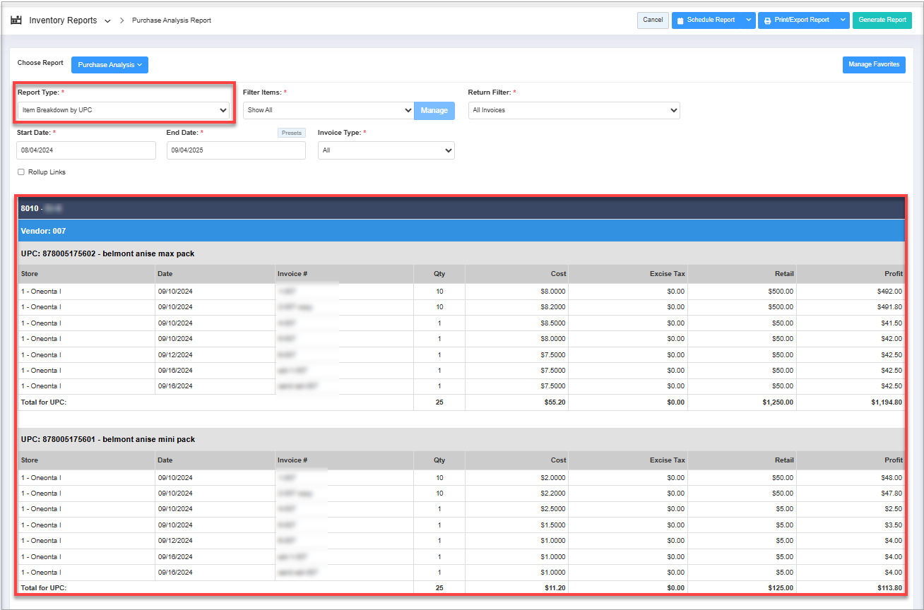 - When you generate the "Purchase Analysis Details" report, all the report data will be similar to the "Purchase Analysis Summary" report, but the Item Name and UPC columns will be additionally visible.