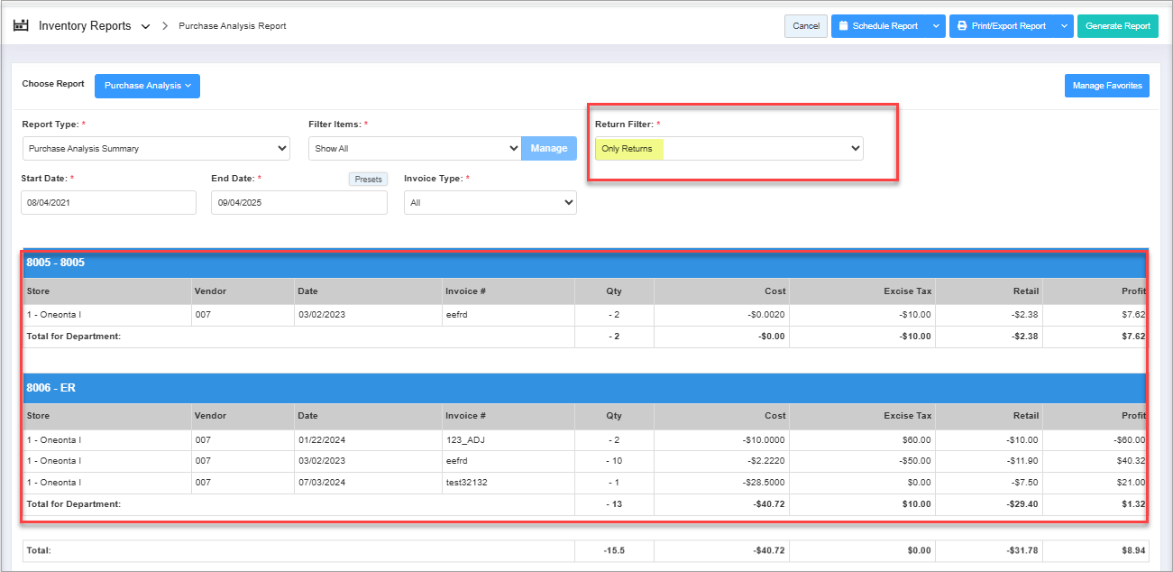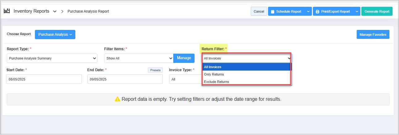 Only Returns: If you select "Only Returns" and generate the report, you can see only the returned item data to the vendor.