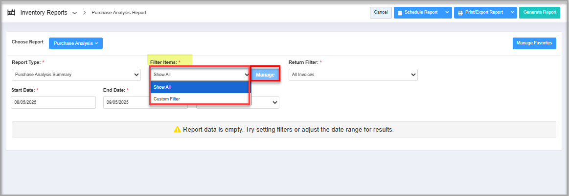 - Manage Filters Drop-Down: Select the saved custom filters from the "Manage Filters" drop-down (if any) and click "Apply" to apply the saved custom filter. The system will redirect you to the Purchase Analysis Report home screen. Click "Generate Report" to generate the report for the selected filter. Clicking the "Manage Filters" button will also open the list of saved custom filters.
