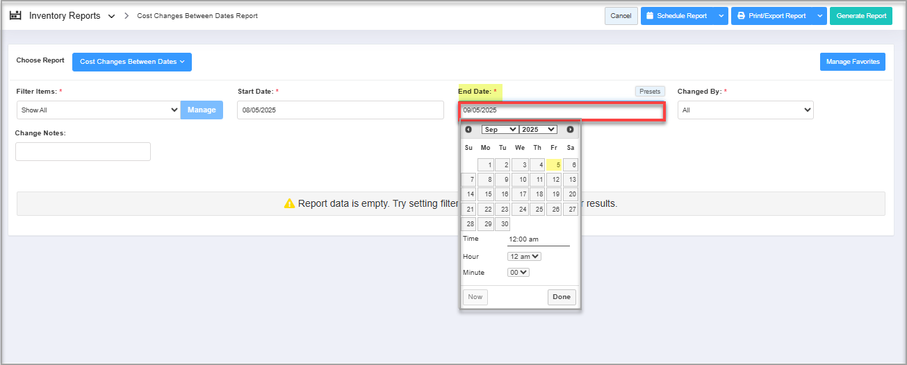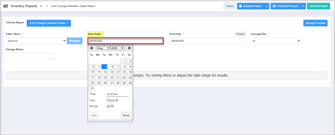 You can filter your purchase analysis date in the report by selecting the date range as well as the specific time.