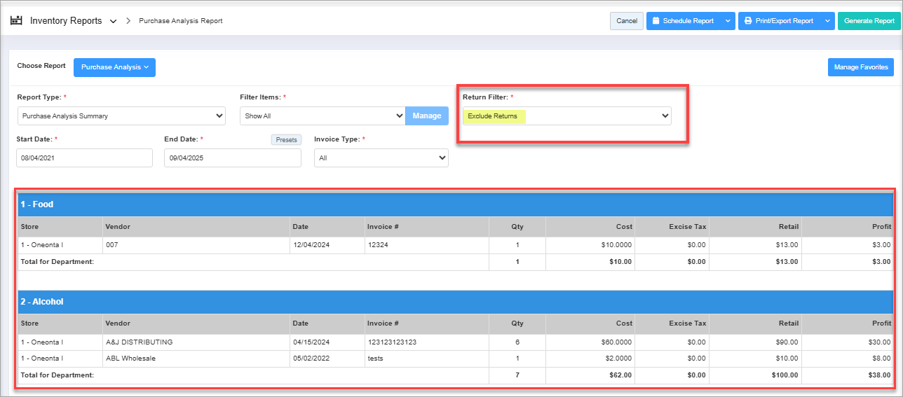 - Exclude Returns: If you select "Exclude Returns" and generate the report, you can see only the purchased item invoice data in the purchase analysis report.