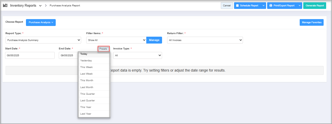 Hence, you can set up multiple custom filters and select the relevant Report Type at the same time to get the purchase report with the specific data.5. Scheduling a Report