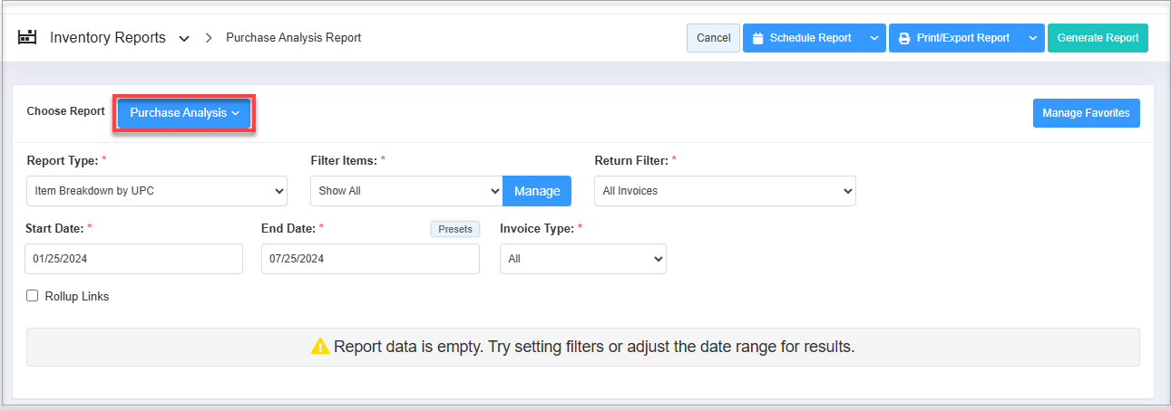 By clicking the "Purchase Analysis Report," you will be redirected to the "Purchase Analysis Report" page with relevant filter options.