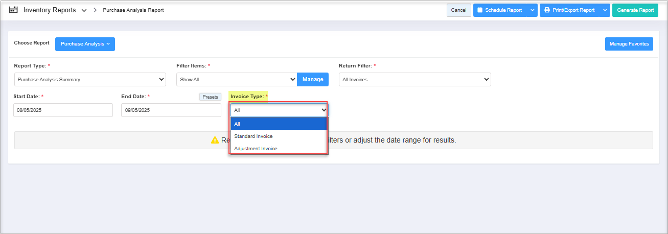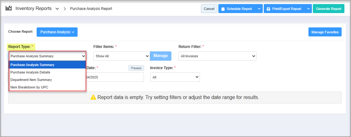When you navigate to the "Purchase Analysis Report" page, you will get the options pre-selected by default. You will see the "Report Type" drop-down selection to generate the purchase report with specific data.