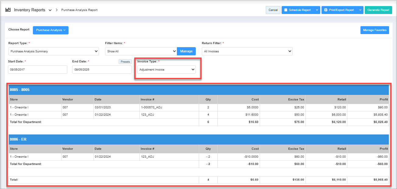 You can filter the purchased data based on the invoice types - "Standard Invoice" and "Adjustment Invoice."