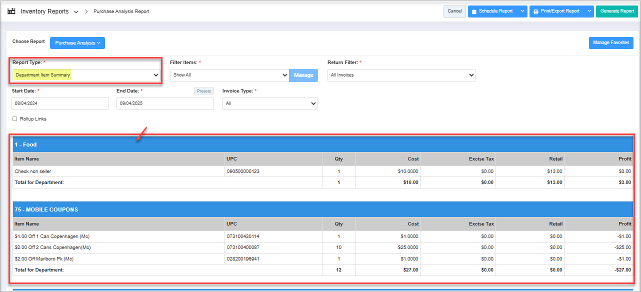 By selecting the "Department Item Summary" type, you will get only the department-specific item details that were purchased within the selected date range.
